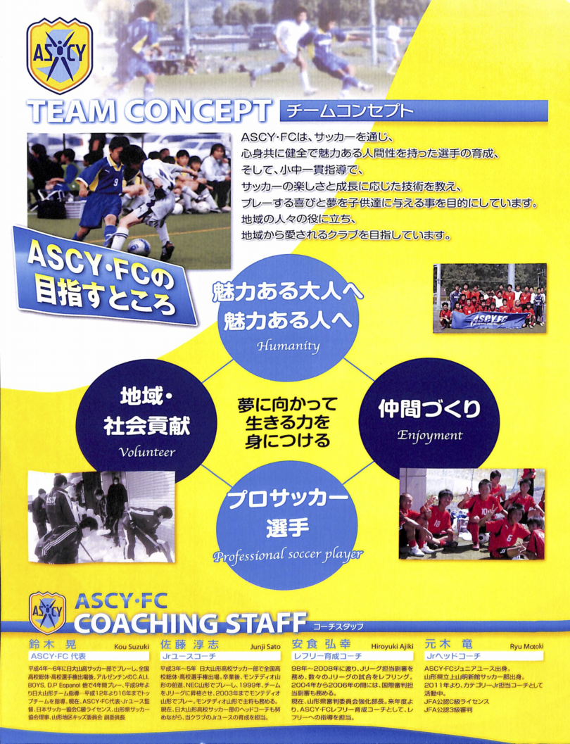 ASCY.FCのチーム名は、「総合スポーツクラブやまがた」の各単語の頭の文字をアルファベットに変えた名称です。